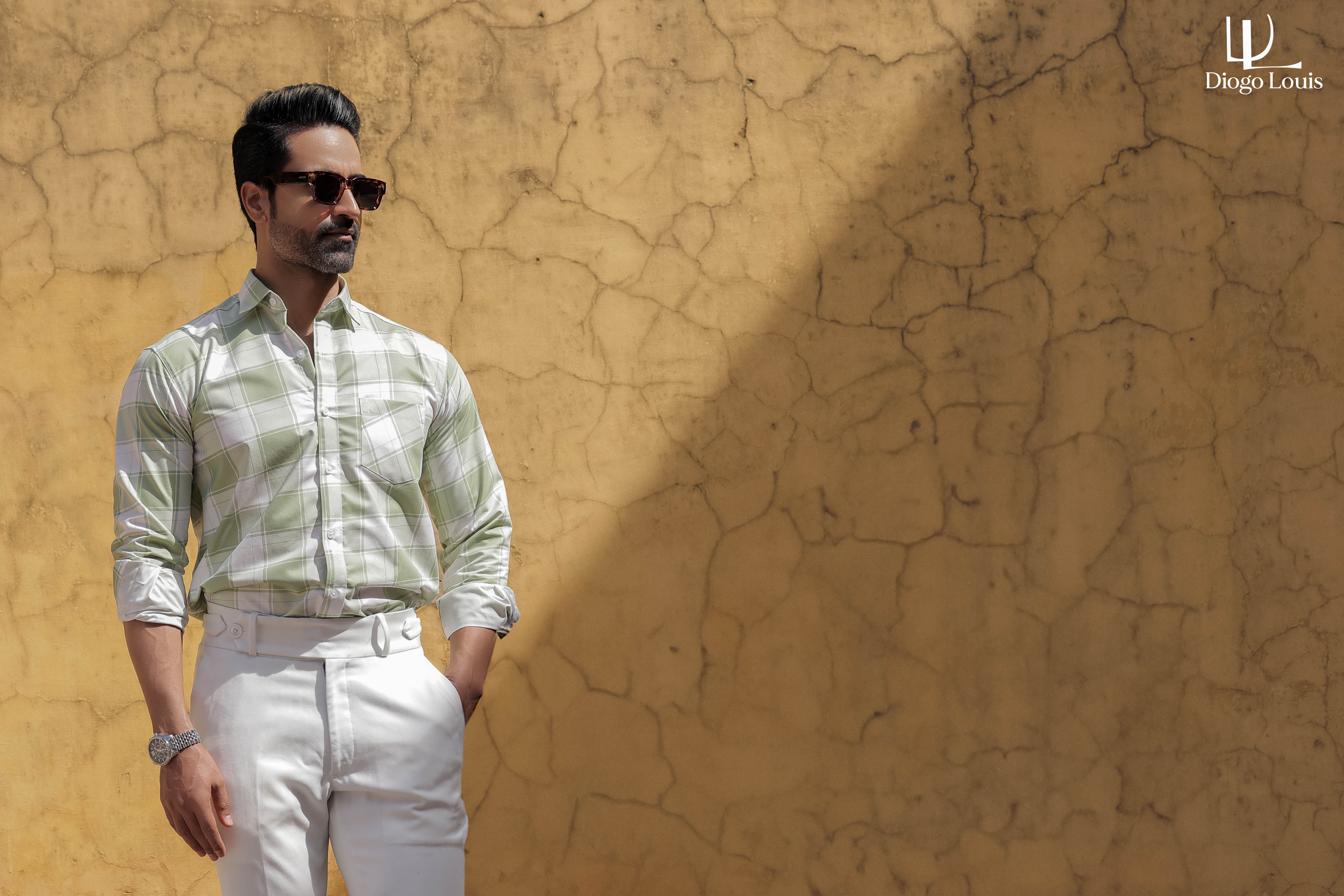 White Strip Checked Cotton Blend Formal Shirt for Men Turquoise Green